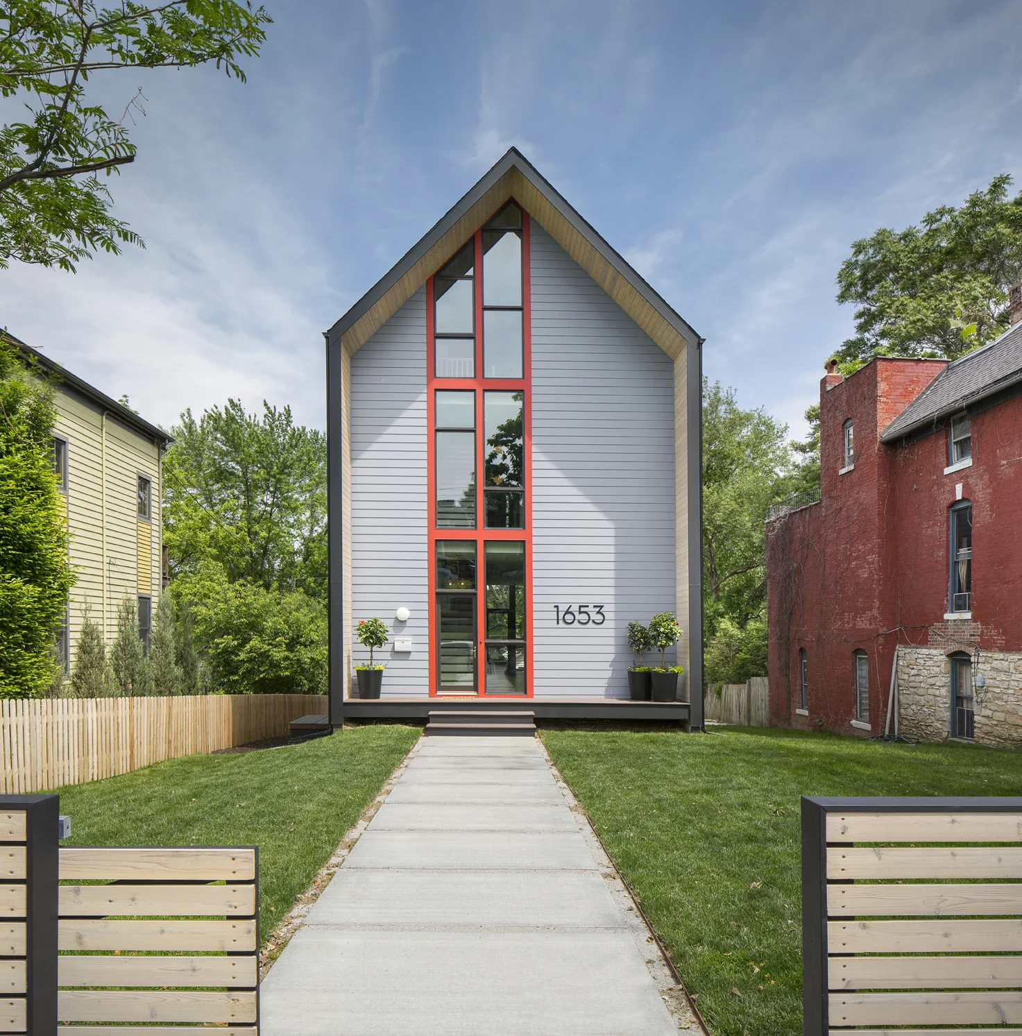 The 1653 Residence is located in Kansas City’s Westside neighborhood. Located within walking distance of downtown Kansas City, the neighborhood is an eclectic mix of restaurants, small businesses and urban dwellers that covet the city life. By approaching the house on axis with the interior circulation, the order of the house is established immediately. The parti is very simple, the public and private spaces are divided by the vertical circulation. This allows the floor plan to be reasonably open with minimal walls. Roughly 2,800 square feet, this unique, compact and simple modern home has 3 bedrooms, 2.5 baths and a completely open office located on the third floor. This home is filled with custom casework designed and fabricated by Studio Build at their office located a few blocks away in Kansas City’s Crossroad's District. One of the most unique elements of this house is the Master Bathroom. It is revealed by passing through one of the built-in closet doors. The soaking tub is inside of the shower enclosure and skylights flood the space with natural light. Off street parking is always in high demand in urban neighborhoods. This house has a full 2 car garage accessed from the alley way behind the house. You can see more process photo's on Instagram using the hashtag #1653residence. We also posted a walk-through video on YouTube.