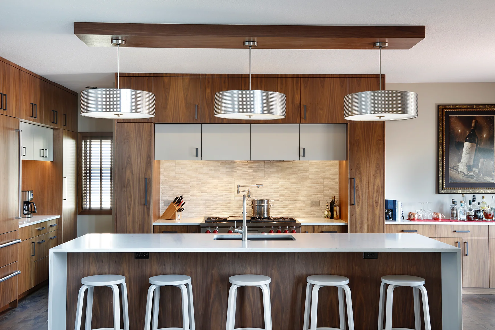 To achieve our clients’ goal, we removed the existing built-in pantry and added two new windows. By doing this we were able to bring additional natural light into the space and open up an area for the coffee bar. The coffee bar houses the coffee pot during the day, but by night it can be transformed into a wet bar making it a great place to mix cocktails. The coffee bar is anchored with an integrated Sub Zero refrigerator on the left and a large pantry cabinet on the right. Behind the island, the 48” Wolf range is the life of the party. The range is accented by a 3D tile back-splash and under cabinet lighting. We installed a pot filler on the wall above the range, which makes filling large pots a breeze. The range is flanked by large walnut pantry cabinets that contain pull-out drawers for easy access. We hid the range hood in the colored accent cabinets above the range. Finally, we replaced the duel-level island with a large single level quartz island with waterfall ends, which houses an integrated Asko dishwasher and a pull-out trash drawer. Three 18" diameter George Kovacs pendents illuminate the room and adjacent surfaces. The storage cabinets on the right of the range not only serves home for the alcohol collection but easily transforms into a serving buffet when it is party time!